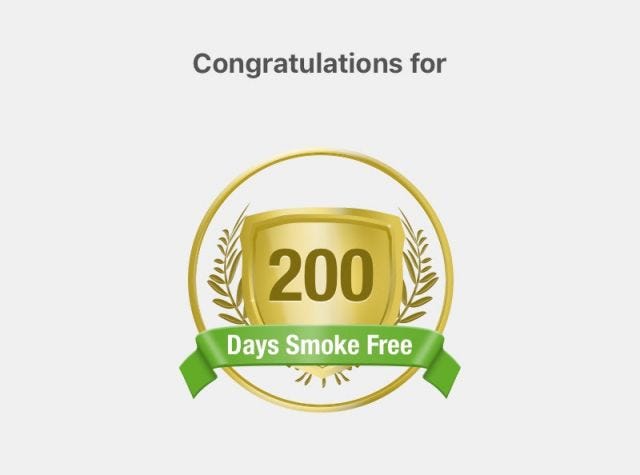 A week ago exactly was 200 days since I quit smoking. My app of choice (Smoke Free for iOS) alerted me of this in characteristic fashion: