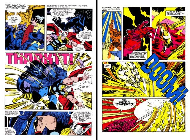 Here’s John Workman over Walt Simonson. There’s a good reason everyone recognises the round, airy balloons, the broken borders, the massive SFX slapped on large swathes of the art. a. They looked good – no – great, and b. You bloody noticed them. People talk about them thirty years later with awe.